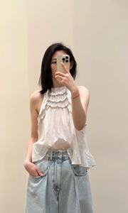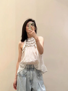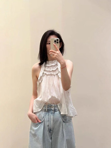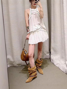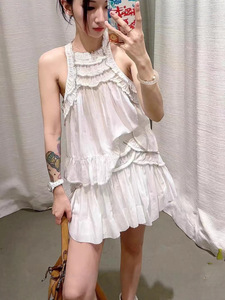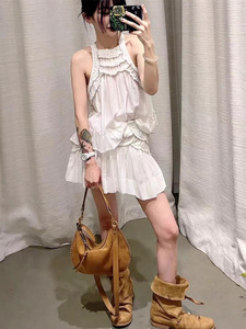 フレンチIS25初秋新作ホワイトレースオフショルダーノースリーブベストプリーツルーズトップ+スカート