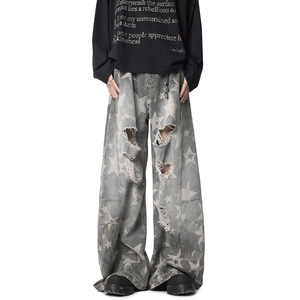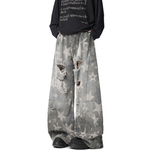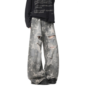美式复古星星印花做旧破洞牛仔裤男女同款街头亚比朋克阔腿长裤子