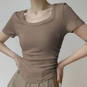アメリカンレトロなプリーツデザインUネックスリムフィット半袖Tシャツカーブヘムボトムピュアセクシーシックトップ