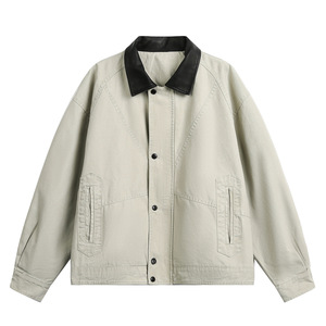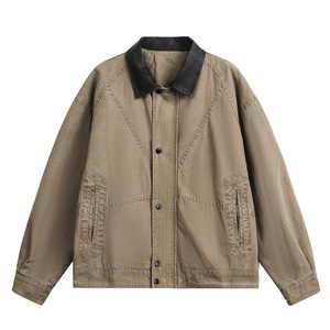 日系复古阿美咔叽底特律工装夹克男女宽松水洗PU皮领拼接帆布夹克
