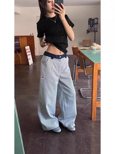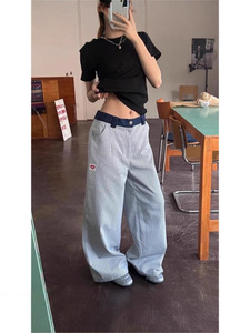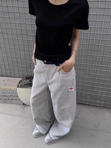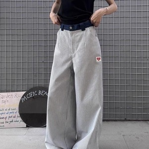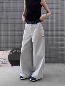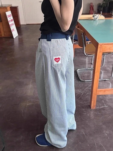 跨境蓝色竖条纹裤子夏季薄款爱心刺绣阔腿弯刀裤小众直筒休闲长裤