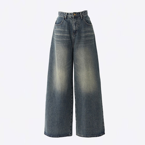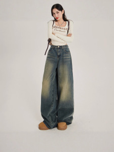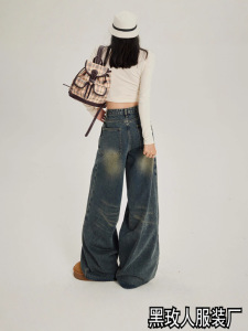 美式复古怀旧高腰宽松阔腿裤百搭秋冬直筒牛仔裤女潮长裤拖地设计