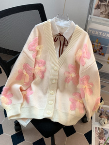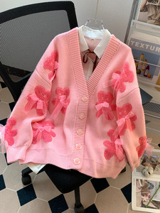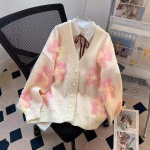 慵懒风超好看可爱小熊蝴蝶结V领开衫毛衣女秋冬2025新款针织外套
