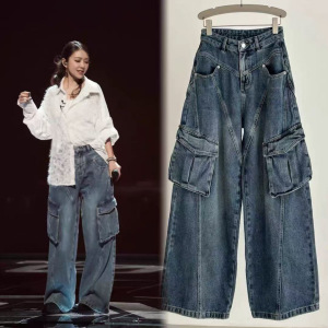 梵思羽明星同款高腰显瘦宽松直筒工装裤阔腿多口袋牛仔裤女10909