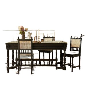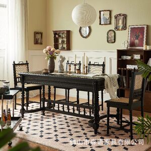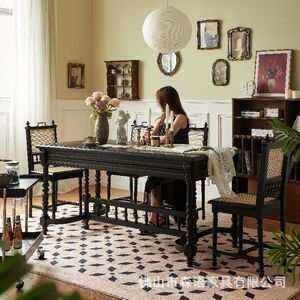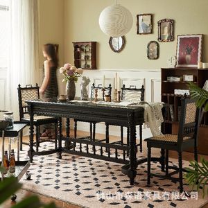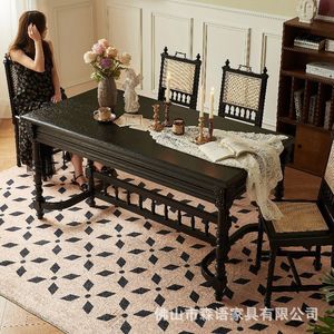 フレンチレトロ無垢材ホーム長方形アメリカン彫刻ログダイニングテーブルライトラグジュアリーモダンシンプルブラックスクエアテーブル