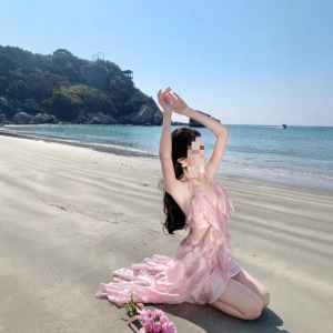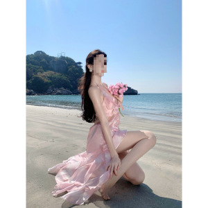 现货2025高品质泡沫幻想气质粉色渐变纱多层荷叶边挂脖露背连衣裙