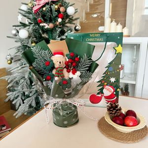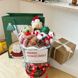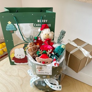 SD015-小さなグリーンクリスマスベアウールブーケ+ギフトバッグ+グリーティングカード+ライトストリング