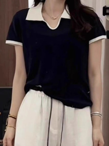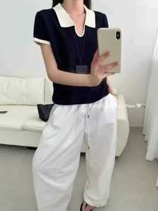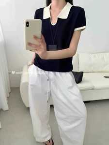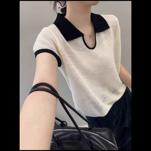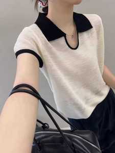 竹节麻polo领撞色针织短袖上衣女2025夏季新时尚小众别致短款t恤