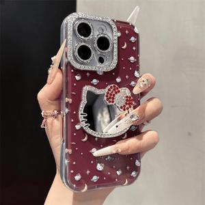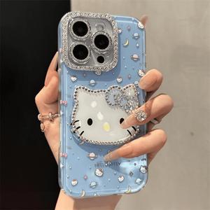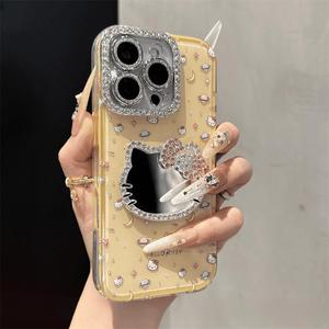 镶钻kitty猫镜子适用苹果16promax手机壳新款iPhone15Pro高级14pl