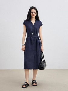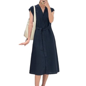 クロスボーダー C Xiaoheya リネン無地 V ネック ノースリーブ レースアップ ウエスト 通勤 ミドル丈 ワンピース レディース 910 232 0