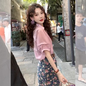 法式小资粉色短袖雪纺衬衫女装2025新款夏季衬衣高级感泡泡袖上衣