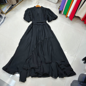 十三行澳洲小众轻奢度假沙滩V领泡泡袖拼接蕾丝大摆连衣裙A2#8118