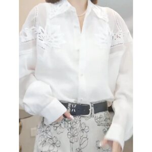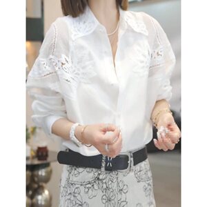 大きいサイズのデザイン刺繍レース白長袖シャツ女性のための 2025 春のファッション気質襟シャツトレンド