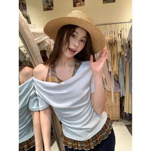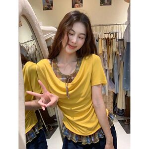 美式多巴胺穿搭假两件短袖t恤上衣女士2025新款爆款格纹拼接小衫