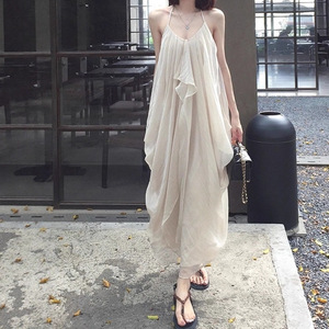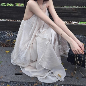 夏季2025新款海边度假风沙滩漂亮长裙子名媛法式白色挂脖连衣裙女