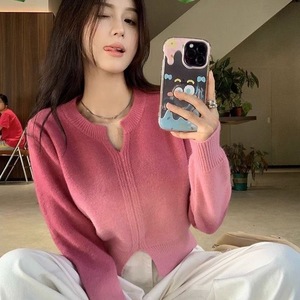 高级感粉色渐变色v领开叉毛衣女秋冬针织内搭打底衫修身短款上衣