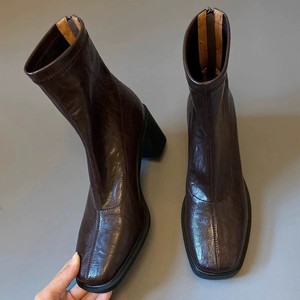 软皮复古气质粗跟方头弹力瘦瘦靴女高跟通勤短靴秋冬加绒马丁靴