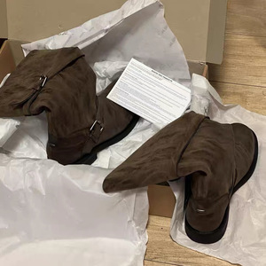 牛皮版~宽松复古皮带扣堆堆靴女两穿褶皱高筒骑士靴粗跟长筒靴