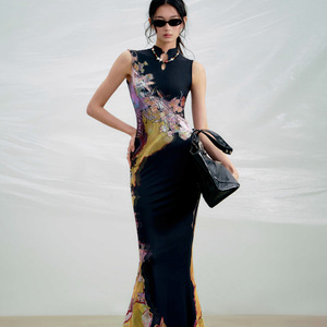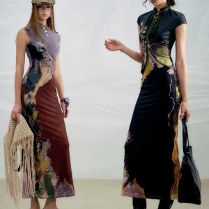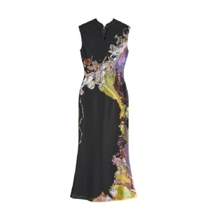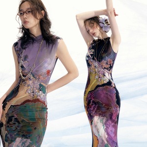新中式前後着用可能なツートンカラーのプリント旗袍ワンピース、レトロ風旗袍、女性用高級ワンピース