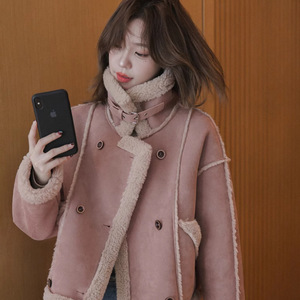 秋冬の女性用毛皮一体型ショートコート、ハイネック模造鹿革ベルベット、レイジースタイル、ゆったり痩身バイクウェア、Shenglong