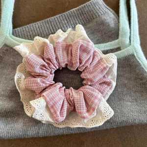 ピンクのチェック柄のパーマヘアゴム