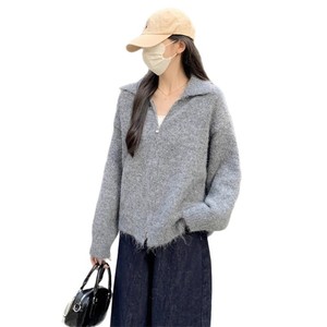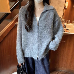 韩系翻领拉链毛衣女装秋冬新款慵懒风宽松软糯毛绒感针织开衫外套
