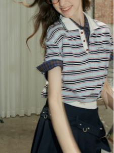 ポロカラーストライプルーズニット半袖Tシャツレディース夏カジュアルレイジースタイルシンプルで万能な半袖