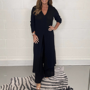 2025 新しい夏のカジュアルスーツヨーロッパとアメリカのクロスボーダーアマゾン女性のスリットロングトップとパンツ 2 点セット