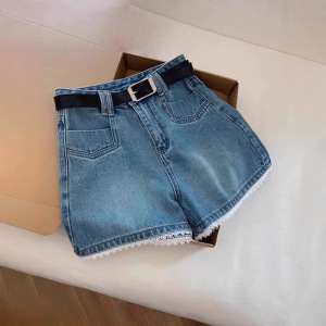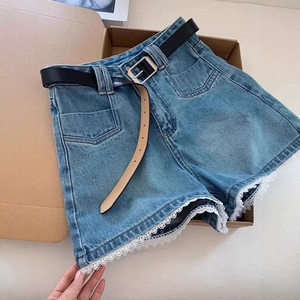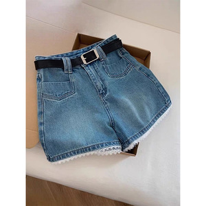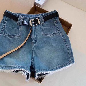 蓝色牛仔短裤女装2025夏季复古甜妹高腰蕾丝花边拼接休闲牛仔短裤