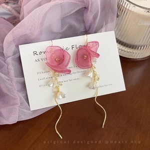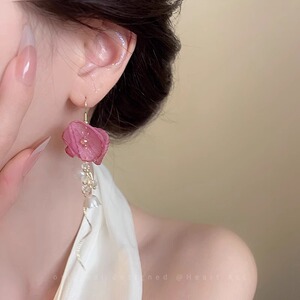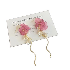 粉色薄纱花朵流苏耳环女款法式度假风长款耳饰独特设计感夸张耳饰