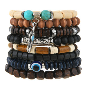 新しいボヘミアンスタイルウッドビーズレトロフェザーブレスレットシンプルカジュアルメンズ多層DIYブレスレットセット