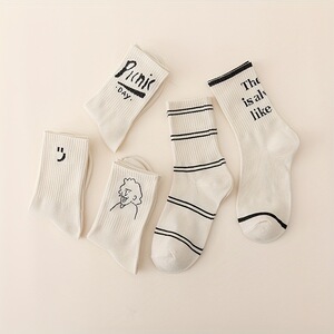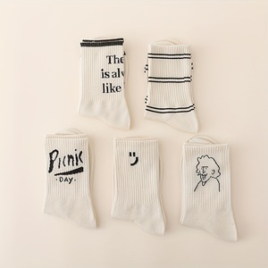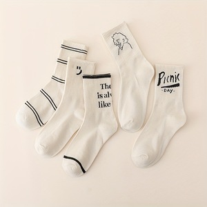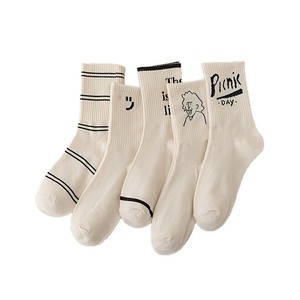 袜子女中筒棉袜 春秋奶白色ins风字母条纹女袜韩版学院风中筒袜女