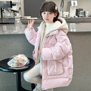 2025 子供服偽ツーピースガールズシーズン新ダウンコットンジャケットミッドレングス厚く暖かいフード付きジャケットと中綿ジャケット