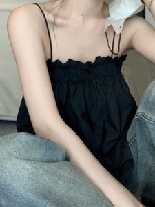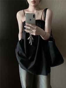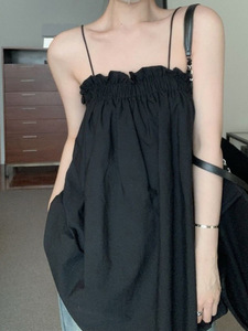 女性用ワンショルダードールシャツキャミソール、夏の新しい黒のゆったりとしたタイスタイルのミドル丈トップス、外で着用して肉をカバーできます