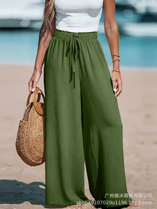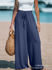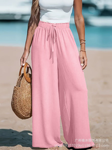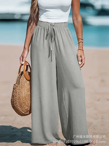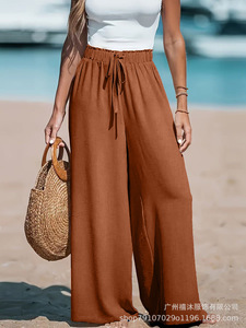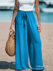 2025 クロスボーダー Amazon ヨーロッパとアメリカの女性の四季綿とリネンのワイドレッグルーズ巾着カジュアルファッションパンツ