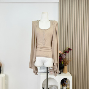カーキ薄手の夏ニットスーツ不規則なデザインのカーディガンスリムベストサスペンダーレディース