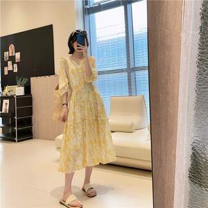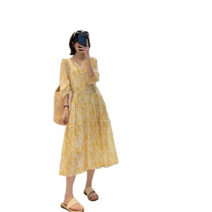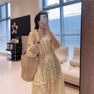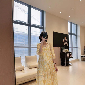 浪漫度假风!无尽夏的诗行~天丝印花珠链V领显瘦大摆中长款连衣裙