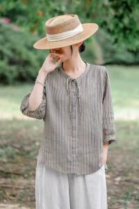 条纹苎麻中袖衬衫2025日系森女系简约系带圆领百搭宽松开衫上衣女