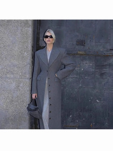 毛呢西装领收腰长款风衣大衣外套