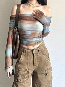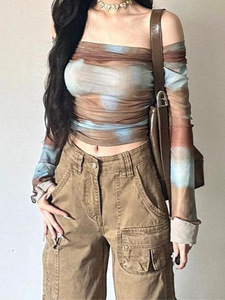 女性用ワンショルダーTシャツ、春スリムフィットトップ、グラデーションへそ出し長袖ボトムシャツ、2025年夏新スタイル