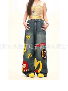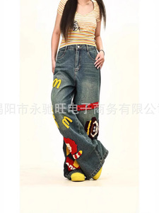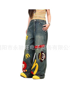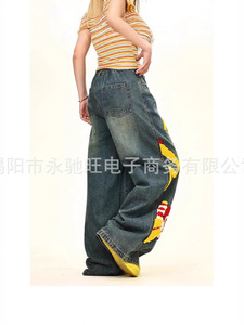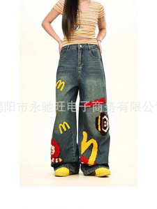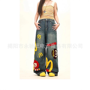 夏のトレンドの新しいアメリカンレトロな楽しいファッションパンツ、男性と女性のための夏のトレンディなブランドデザインの漫画ジーンズ