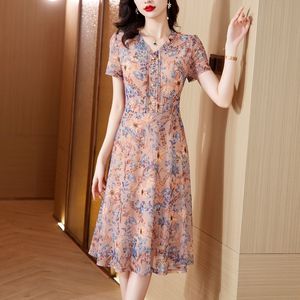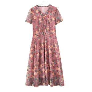 新网纱印花连衣裙女短袖2025夏季大码中长裙修身显瘦妈妈装厂直供