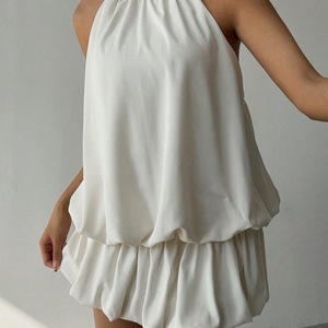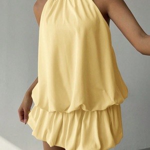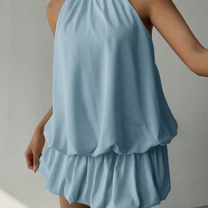 法式纯色挂脖露肩连衣裙女夏季海边度假辣妹收腰蓬蓬裙包臀短裙子