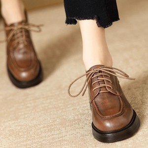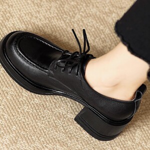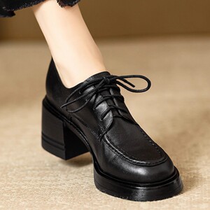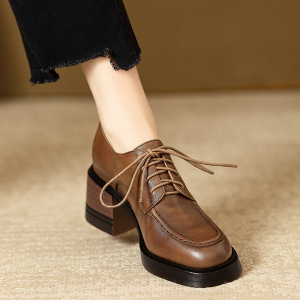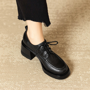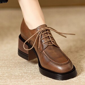 英伦风复古真皮厚底圆头深口系带单鞋女2025春秋新款粗高跟小皮鞋