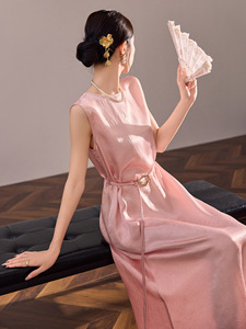 新中式纯色连衣裙2025新款夏季高冷御姐风气质收腰醋酸长裙 N6009