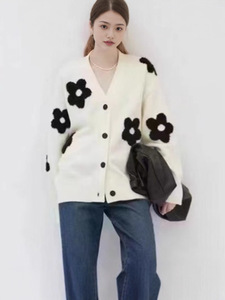 ヨーロッパとアメリカの春、秋、冬の新しいスタイルのVネック立体ジャカードレイジースリミングフラワーニットセーターカーディガンセータージャケット女性用