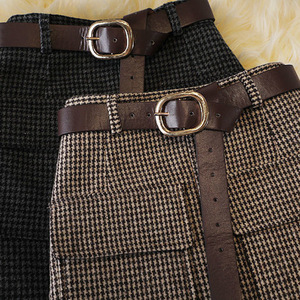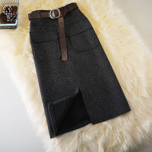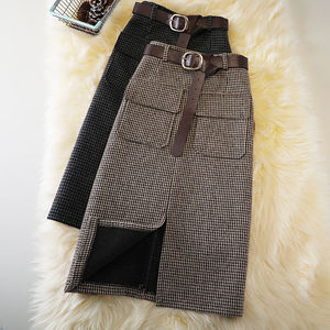秋冬小千鸟格高腰半身裙女新款韩版毛呢口袋中长款一步裙开叉裙子