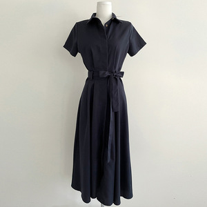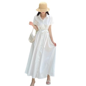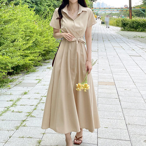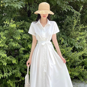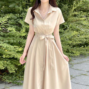 フレンチスタイルの女性用シャツワンピース、夏、シンプルで高級感のあるレースアップウエスト痩身半袖ロングスカート