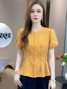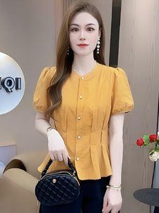 小个子百搭短袖衬衫女洋气通勤小衫夏装新款褶皱收腰上衣休闲衬衣