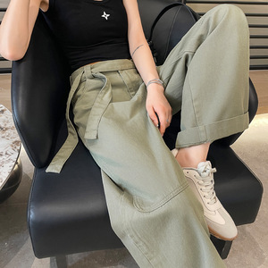 美式复古工装裤女灰绿色飘带休闲阔腿牛仔裤女高腰宽松显瘦拖地裤